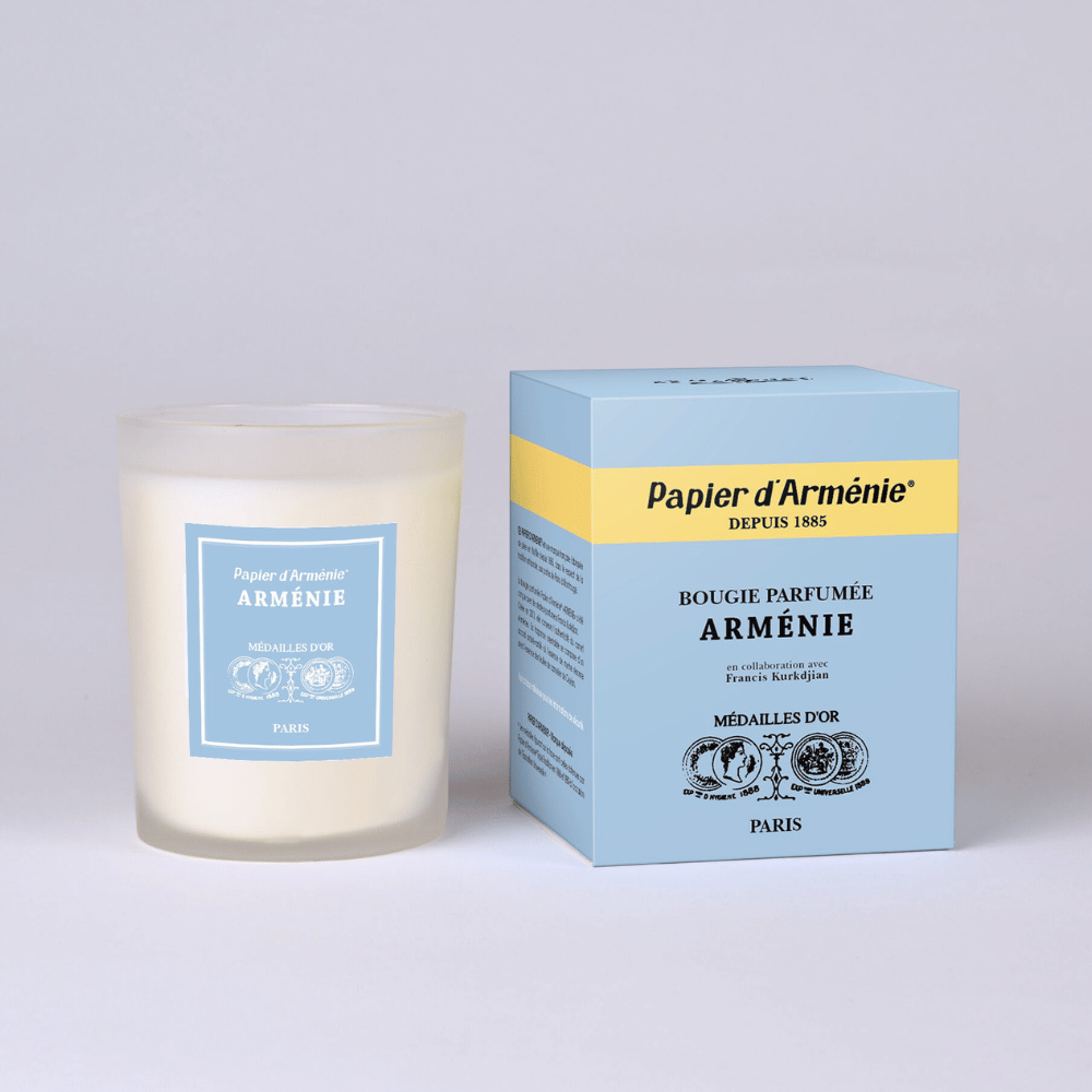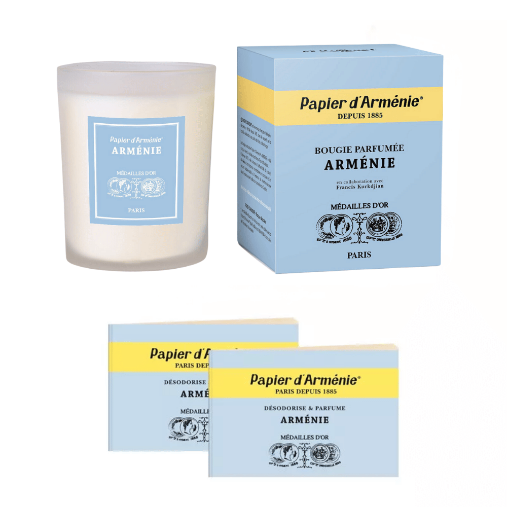 Une bougie Arménie et deux carnets Arménie pour un véritable voyage olfactif. La myrrhe, la sauge, la lavande et le bois de cèdre composent ces senteurs orientalistes.