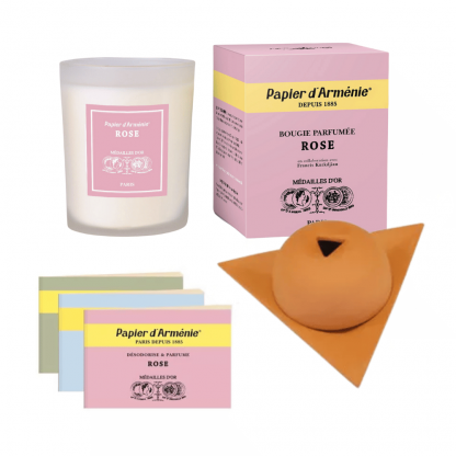Le PACK PRESTIGE ROSE réunit les produits incontournables de la gamme. Consumez les petites bandelettes dans un brûleur Étoile d’Arménie de votre choix et appréciez les senteurs gourmandes de la bougie ROSE !